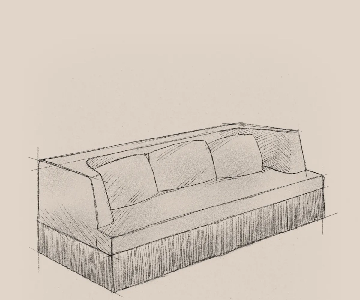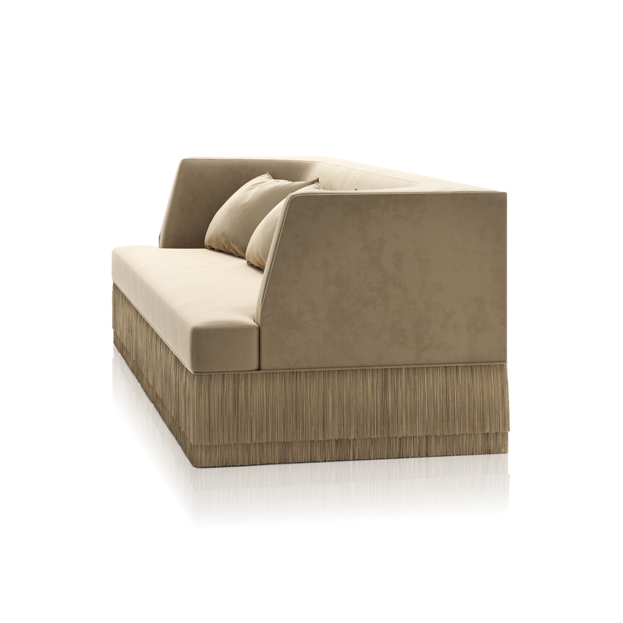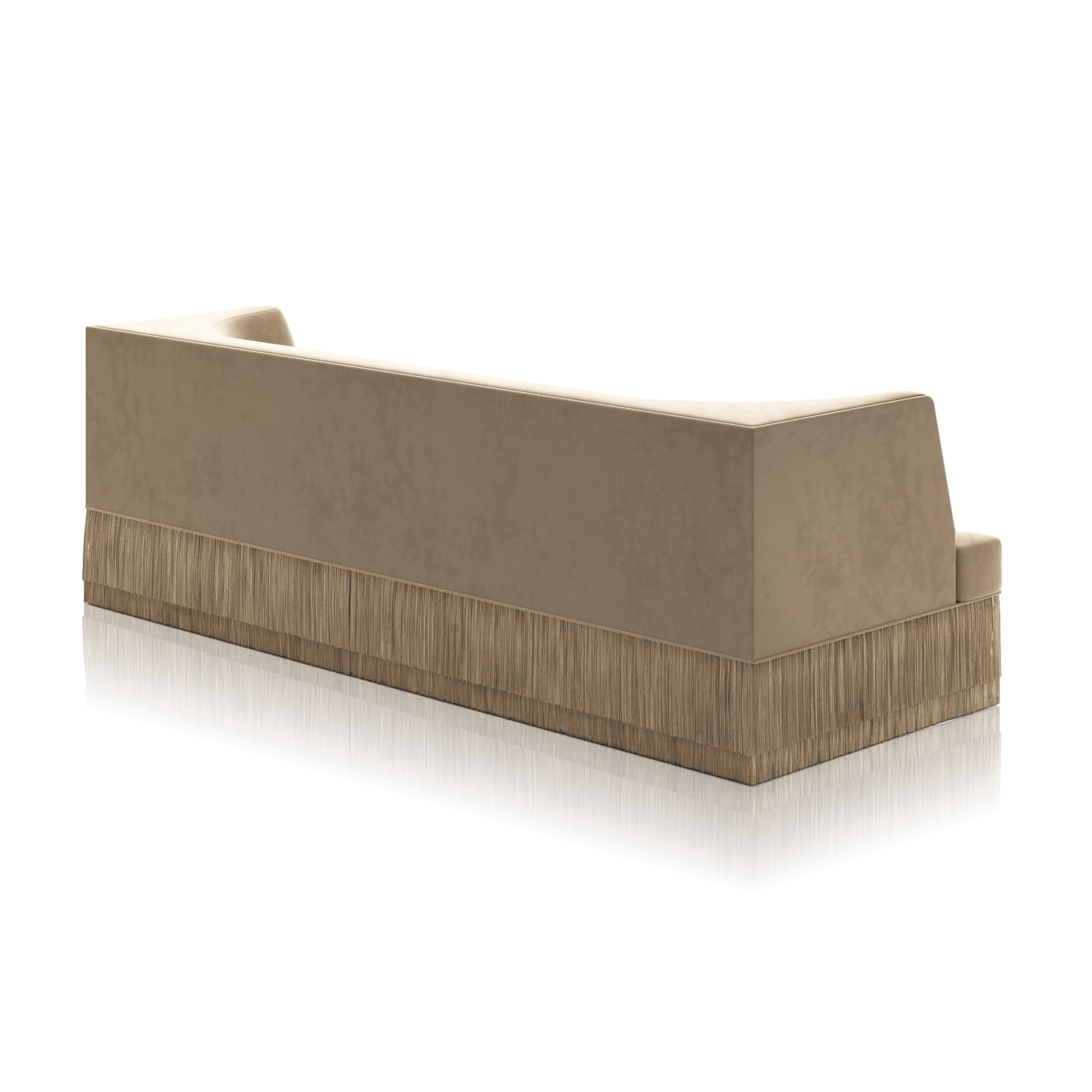 The Alcove Sofa carries the same sculptural poise and refined comfort as the armchair, now extended into generous proportions. With enveloping backrests and a discreet fringe skimming the floor, it invites pause and presence in shared or solitary spaces.