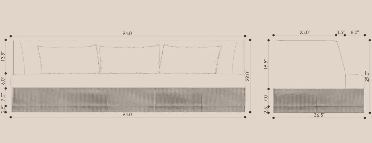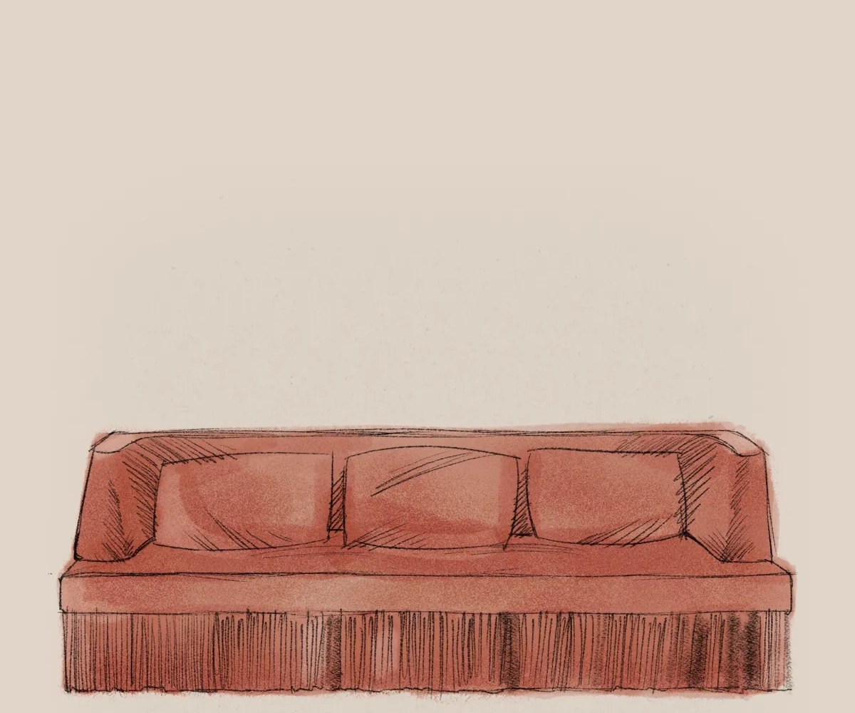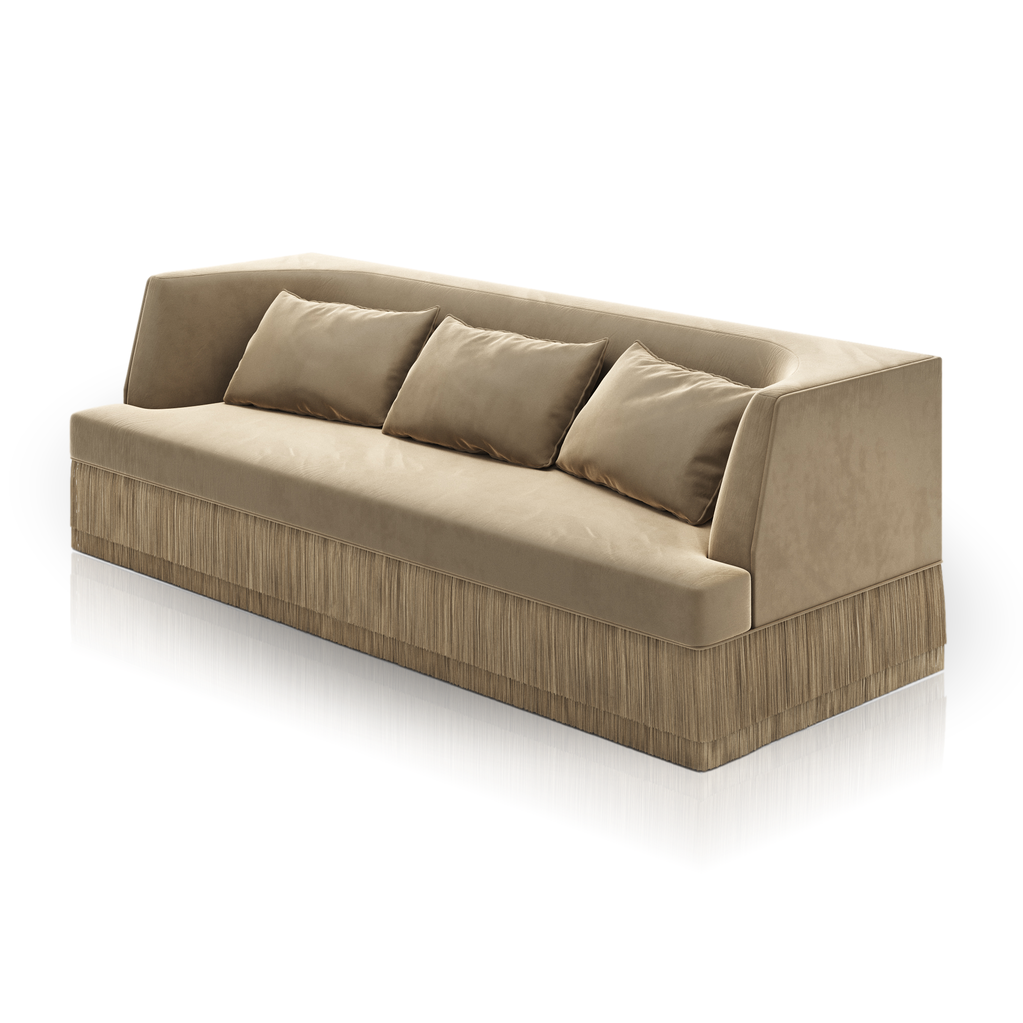 The Alcove Sofa carries the same sculptural poise and refined comfort as the armchair, now extended into generous proportions. With enveloping backrests and a discreet fringe skimming the floor, it invites pause and presence in shared or solitary spaces.