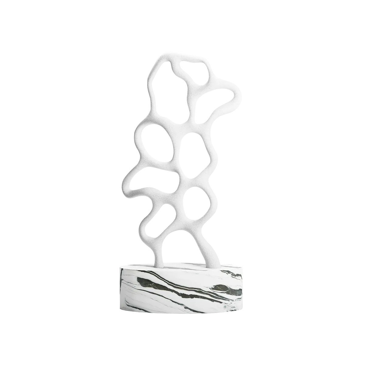 Crafted in reinforced resin and set on a monolithic base, it functions as both screen and sculpture.