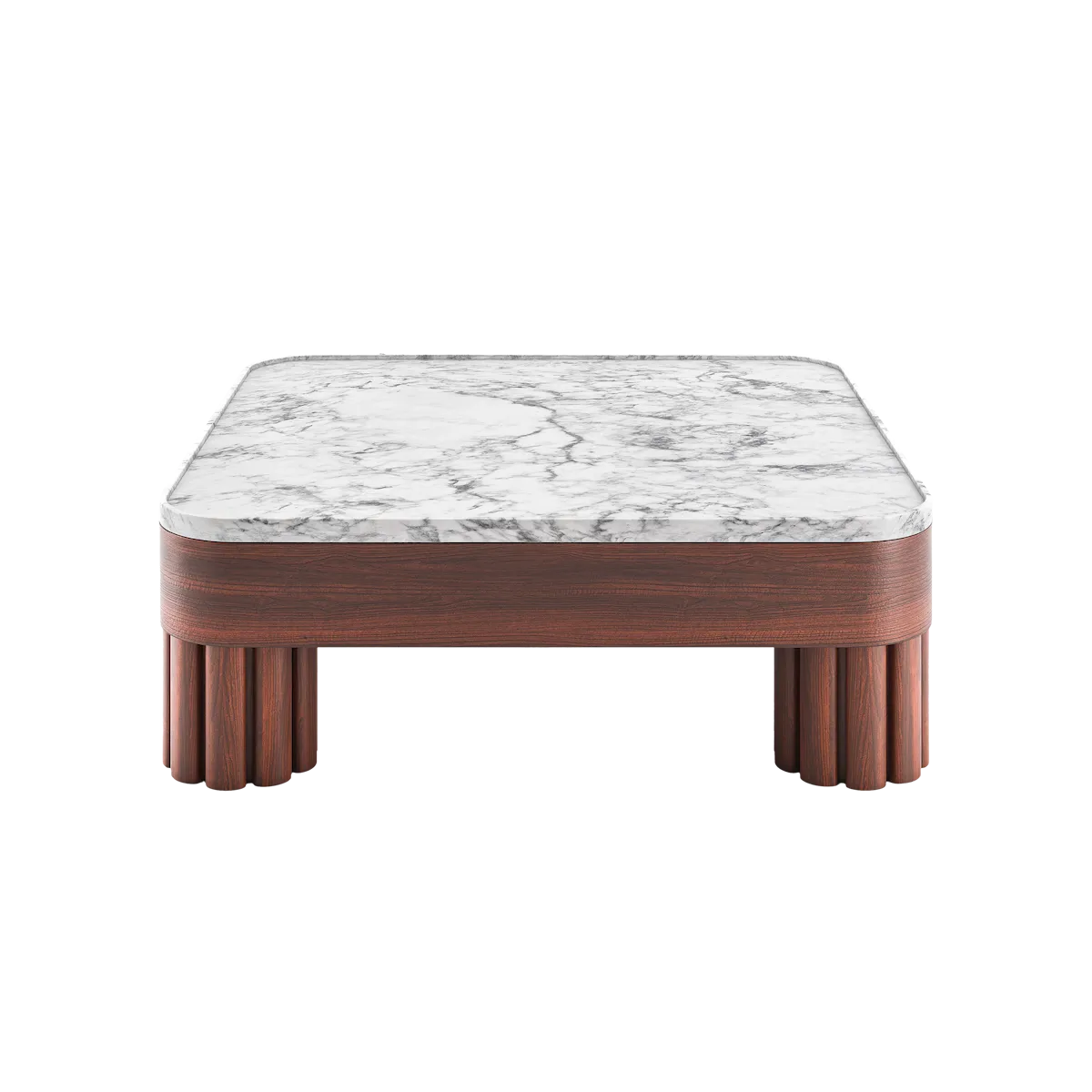Low square coffee table featuring softly rounded corners and a recessed marble tray top with raised edge.