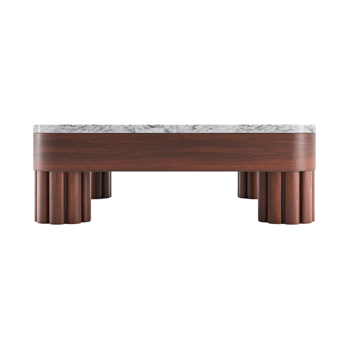 The base is supported by vertically fluted cylindrical legs in solid wood, emphasizing structural rhythm and geometric clarity.