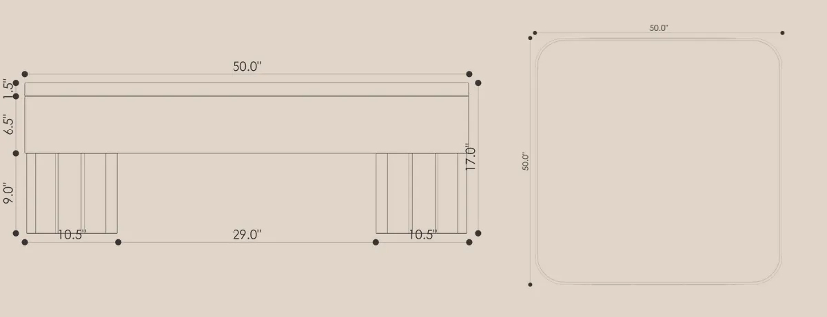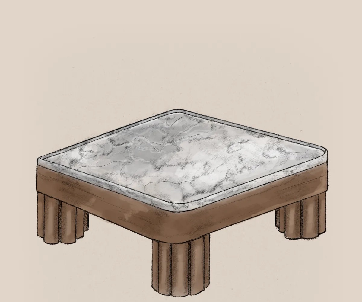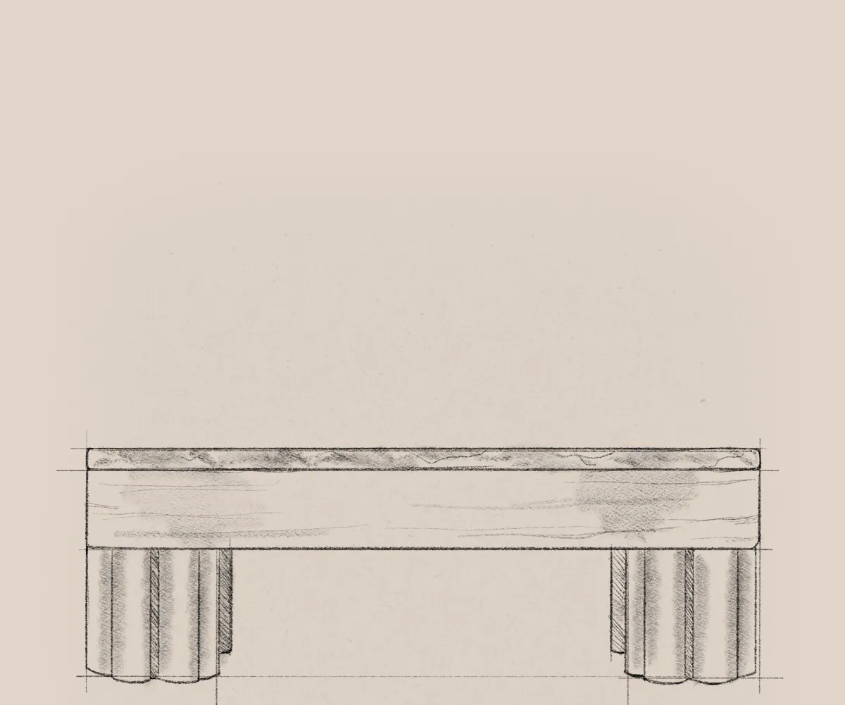 The Ripple Square Coffee Table distills the collection’s essence into a balanced centerpiece. The stone top evokes a still surface, cool, luminous, and grounding. Beneath it, the sculpted base rises in vertical repetition, echoing the language of carved pillars and softened geometry.