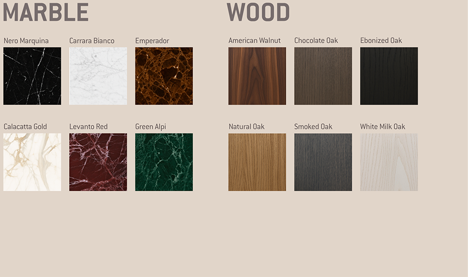 Top options: wood veneer, marble, or lacquered.