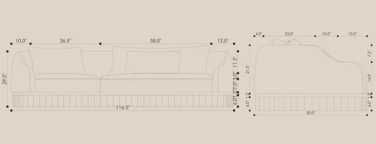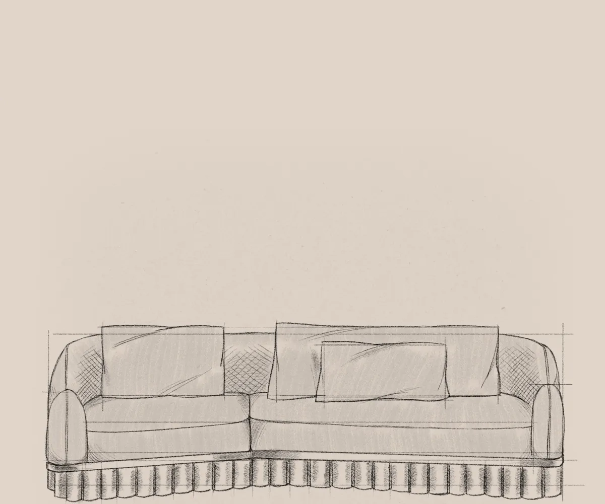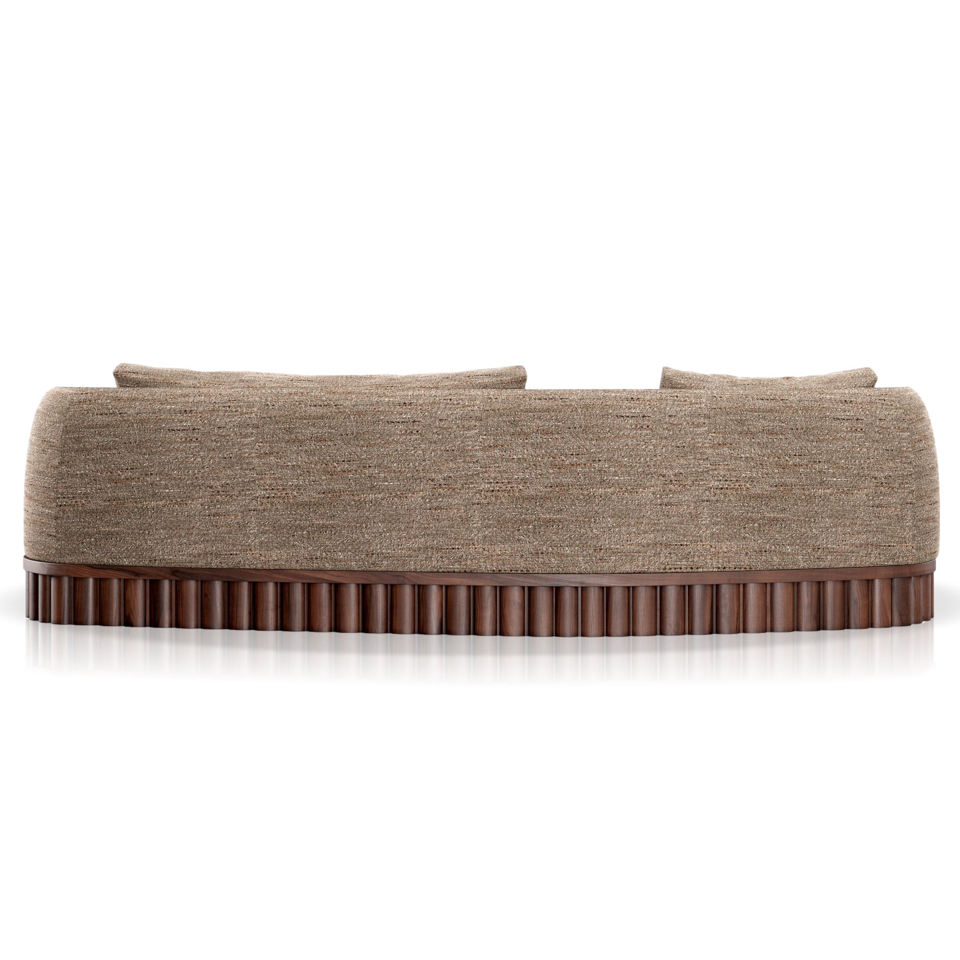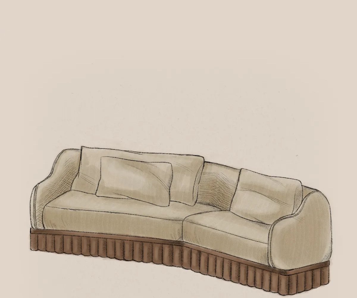 The Ripple Sofa expands the collection’s visual rhythm into generous proportions. Its upholstered body curves with ease, while the carved wooden base offers a grounding cadence of vertical lines, such as a shoreline meeting the water’s edge.